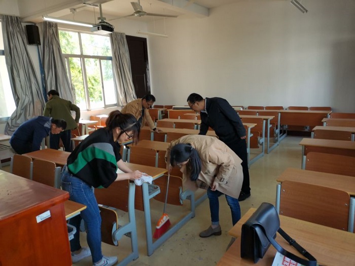 根据主题党日活动安排,支部党员对横江校区全部留学生教室、自修室进行了彻底的卫生保洁。活动过程中,支部全体党员同志积极参与,不怕脏、不怕累,合理分工,互助协作,全面扫除地面垃圾,彻底清理卫生死角,细心擦去桌椅灰尘,然后把桌椅摆放整齐,再全方位喷洒消毒液。在全体党员的共同努力下,留学生教室、自修室面貌焕然一新。通过本次主题党日活动,全体党员强化了责任担当意识,践行了奉献服务精神,有效推进了文明创建活动深入开展,有助于做实做好疫情防控工作,为学生返校创设一个整洁卫生、安全放心的学习、工作环境。