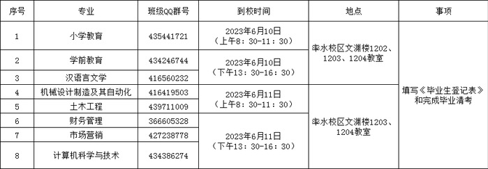 根据学校教学管理及毕业审核事项安排,定于2023年6月10日-6月11日安排成教学员到校填写《毕业登记表》(此表存入本人学籍学历档案,请务必重视,本人到校据实填写)和完成毕业清考事项。《毕业登记表》所有毕业生均需填写,另部分学员需同时完成毕业清考,清考名单及具体安排见教学管理QQ群(群号2022年9月已对外发布,http:/6f/e3/c525a159715/page.htm )通知。填写《毕业生登记表》及毕业清考是毕业审核重要环节,请务必按通知要求到校完成。具体安排如下:
